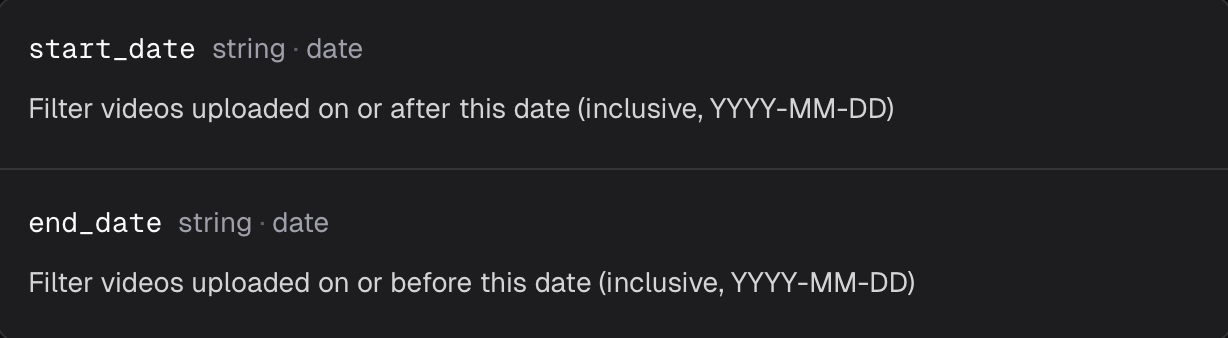 Alongside this, we’ve also introduced new date filtering on the accounts/{account_id}/videos endpoint. You can now use optional start_date and end_date query parameters to return only videos uploaded within a specific time range.