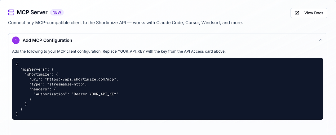 Shortimize can now be plugged directly into your AI coding tools (Claude Code, Cursor, Windsurf, and more) as an MCP server. Use your existing API key to connect and unlock powerful customizability, letting your agents work with Shortimize data natively inside your workflows.
